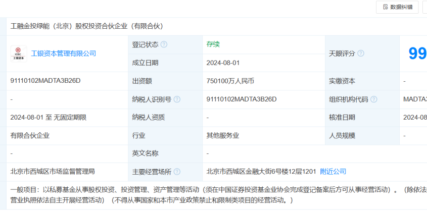 天眼查App顯示,工融金投綠能(北京)股權(quán)投資合伙企業(yè)(有限合伙)近日成立,執(zhí)行事務(wù)合伙人為工銀資本管理有限公司,出資額...