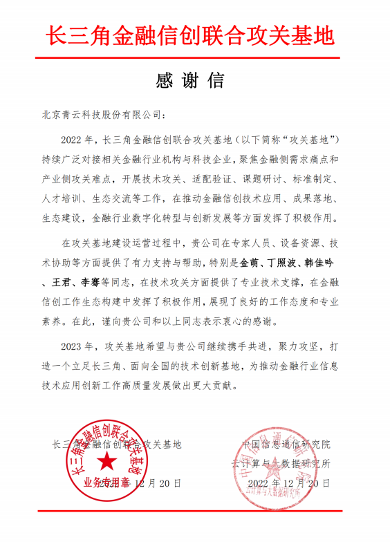 近日,中國信息通信研究院云計算與大數(shù)據(jù)研究所與長三角金融信創(chuàng)聯(lián)合攻關基地(以下簡稱:攻關基地)向青云科技發(fā)來感謝信。