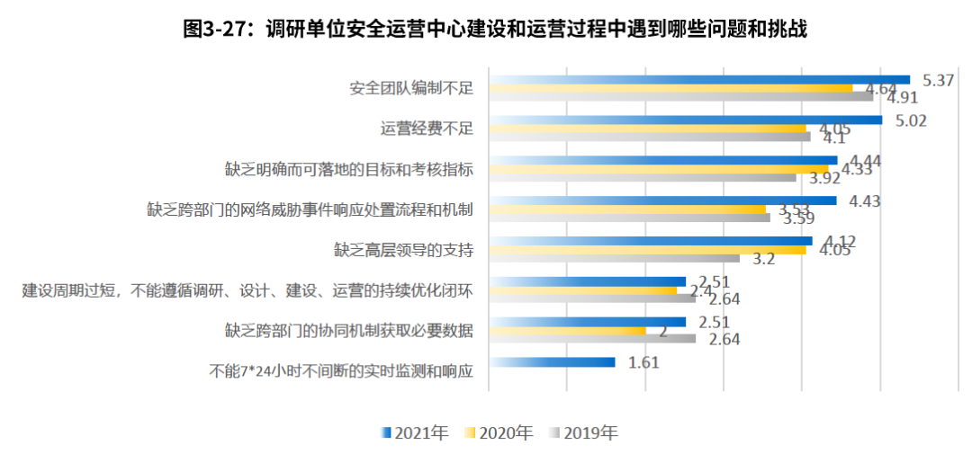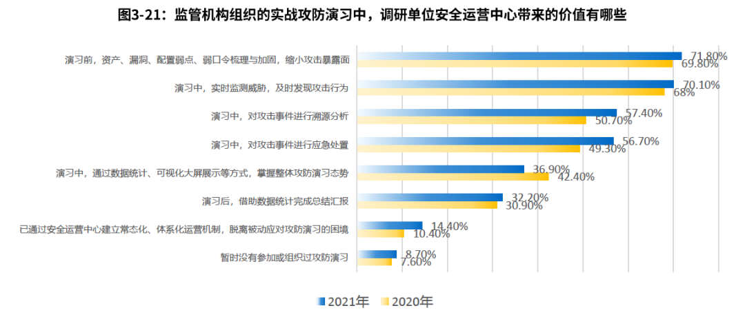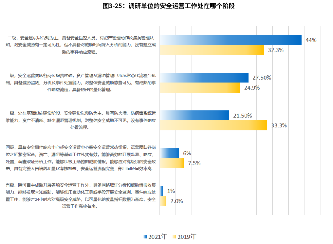 從報告中看出,2021年88.6%的企業(yè)已經(jīng)建立安全運營中心,與2020年79.5%和2019年68.2%相比,呈持續(xù)增長態(tài)勢,越來越多的行業(yè)開始重視安全運營中心建設。且成熟度處于二級和三級的企業(yè)數(shù)量明顯增加。