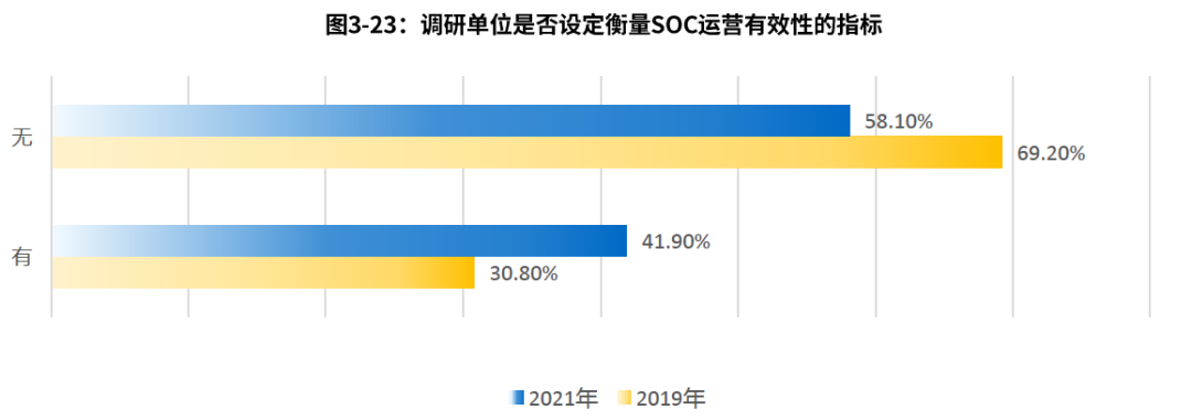 網(wǎng)絡安全是一個高投入但產(chǎn)出不明顯的工作,制定安全運營評價指標,定期對各項工作進行有效性評價,可以量化體現(xiàn)安全運營效果。從調研中看出,設定有效性評價指標的企業(yè)占比由上次的30.8%增長到41.9%。