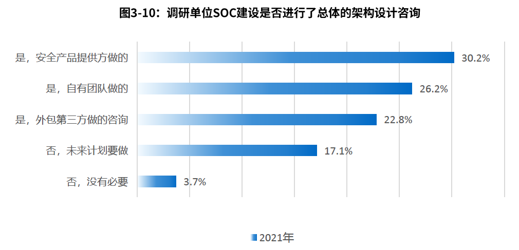 從報告中可以看出,79.2%的企業(yè)在建設安全運營中心時,都進行了總體架構設計。架構設計通過需求調研,成熟度評估入手,通過安全運營體系設計,幫助企業(yè)明確安全運營中心如何建設,將安全產(chǎn)品、安全流程和團隊能力進行整合,體系化開展安全運營中心建設。