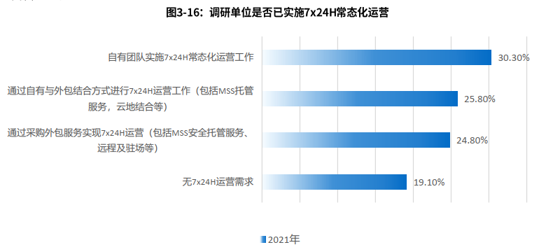 從報告中看出,有80.9%的企業(yè)都實施了7*24常態(tài)化運營。采購托管運營服務的企業(yè)相對較多,占比達65.8%,僅有34.2%的企業(yè)完全沒有托管運營需求。通過7*24小時托管服務實現(xiàn)檢測及響應效率提升,已經(jīng)成為越來越多客戶的選擇。