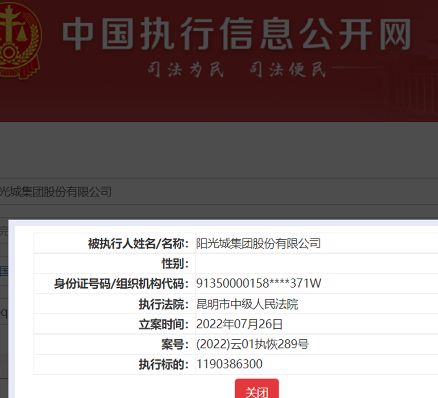 立案時間2022年07月26日,陽光城集團(tuán)股份有限公司新增一則被執(zhí)行人信息,執(zhí)行標(biāo)的11.9億元,執(zhí)行法院為昆明市中級人民法院。