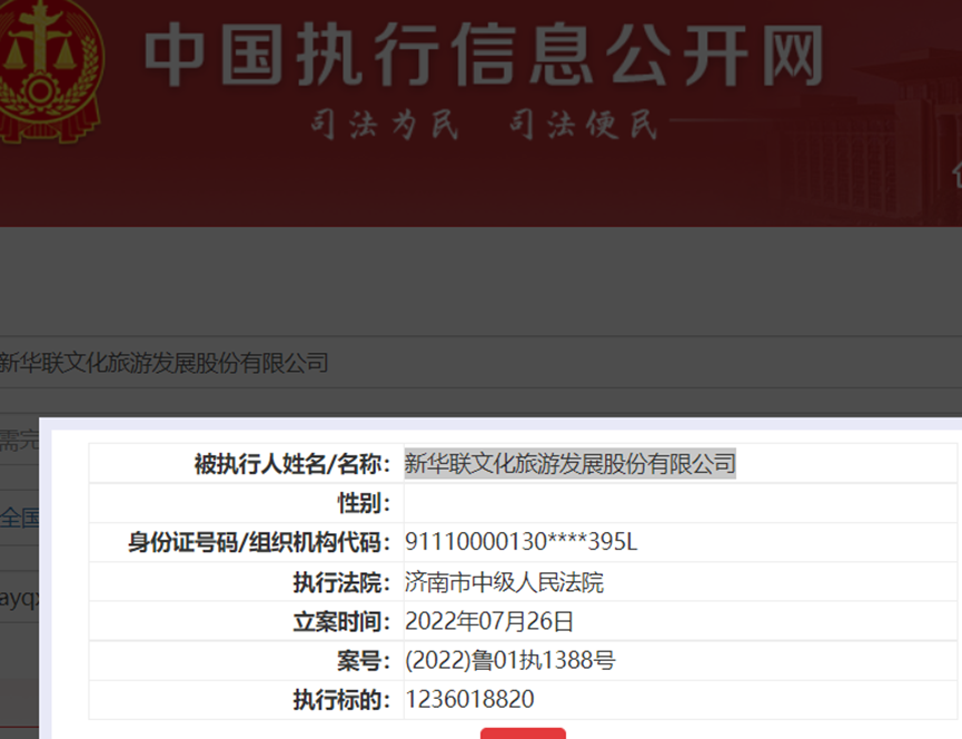 立案時間2022年07月26日,新華聯(lián)文化旅游發(fā)展股份有限公司新增一則被執(zhí)行人信息,執(zhí)行標(biāo)的12.36億元,執(zhí)行法院為濟(jì)南市中級人民法院。