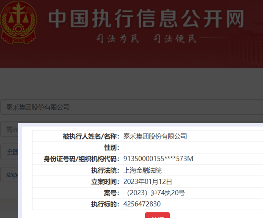 (2023)滬74執(zhí)20號記錄顯示,被執(zhí)行人名稱為泰禾集團(tuán)股份有限公司,執(zhí)行法院為上海金融法院,立案時間為2023年01月12日,執(zhí)行標(biāo)的為42.56億元。