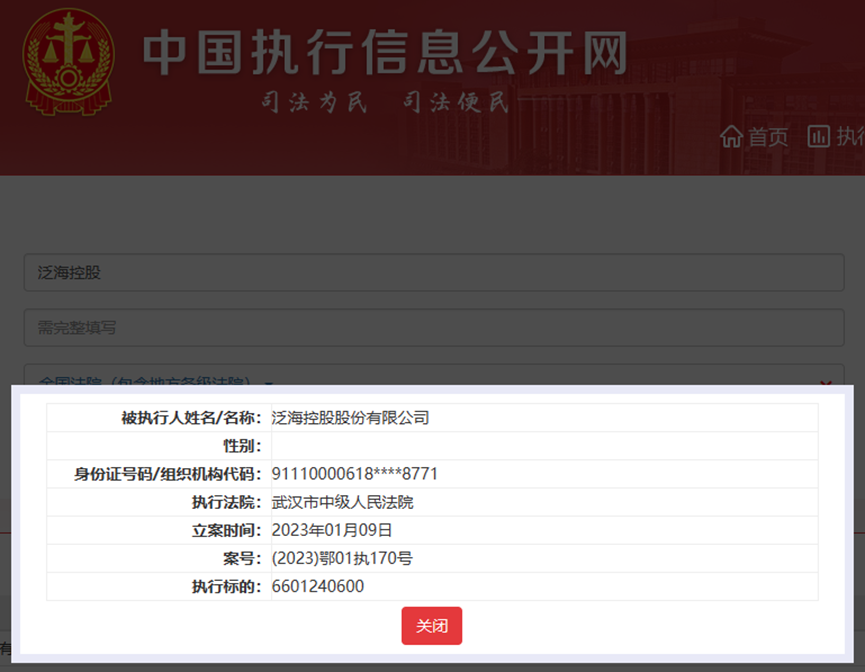 立案時間2023年1月9日,泛海控股股份有限公司新增一則被執(zhí)行人信息,執(zhí)行標(biāo)的66.01億元,執(zhí)行法院為武漢市中級人民法院。