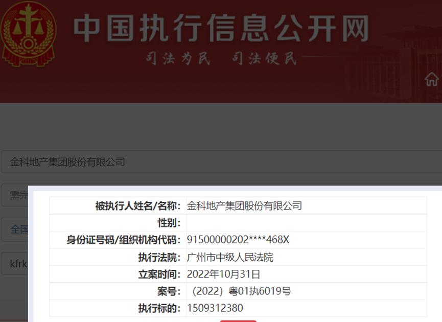 立案時間2022年10月31日,金科地產(chǎn)集團(tuán)股份有限公司新增一則被執(zhí)行人信息,執(zhí)行標(biāo)的15.09億元,執(zhí)行法院為廣州市中級人民法院。