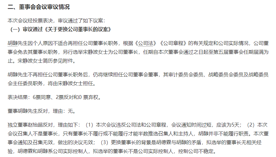 不過,這則選舉除獲得6票支持外,還收到2票反對。除胡醇無理由反對外,獨立董事趙怡超也投下反對票。
