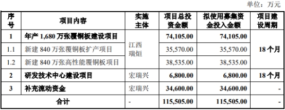宏瑞興原擬在深交所主板公開發(fā)行股票總量不超過3,333.3334萬股,占發(fā)行后總股本的比例不低于25.00%。公司擬募集資金115,505.00萬元,分別用于年產(chǎn)1,680萬張覆銅板建設(shè)項目、研發(fā)技術(shù)中心建設(shè)項目、補充流動資金。