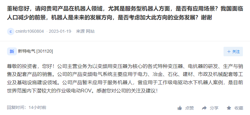 中國財富通1月29日-新特電氣(301120)在互動平臺上表示,公司主營業(yè)務(wù)為以變頻用變壓器為核心的各式特種變壓器、電抗器的研發(fā)、生產(chǎn)與銷售及配套產(chǎn)品的銷售。公司的產(chǎn)品變頻電氣系統(tǒng)主要應(yīng)用于電力、冶金、石化、建材、市政及機械配套等工業(yè)及基礎(chǔ)設(shè)施建設(shè)領(lǐng)域。公司產(chǎn)品暫未應(yīng)用于服務(wù)機器人,曾應(yīng)用于工作級電驅(qū)動水下機器人案例,是目前世界范圍內(nèi)下潛較大的作業(yè)級電動ROV。