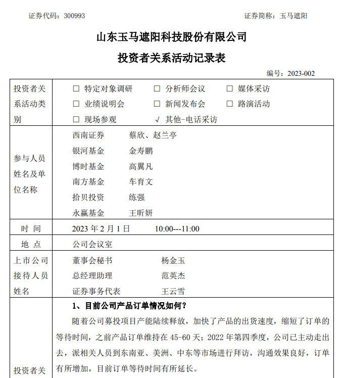 中國(guó)財(cái)富通2月3日 - 玉馬遮陽(300993)(300993)在最新披露的投資者關(guān)系活動(dòng)記錄表中表示,隨著公司募投項(xiàng)目產(chǎn)能陸續(xù)釋放,加快了產(chǎn)品的出貨速度,縮短了訂單的等待時(shí)間,之前產(chǎn)品訂單維持在45-60天;2022年第四季度,公司已主動(dòng)走出去,派相關(guān)人員到東南亞、美洲、中東等市場(chǎng)進(jìn)行拜訪,溝通效果良好,訂單有所增加,目前訂單等待時(shí)間有所延長(zhǎng)。