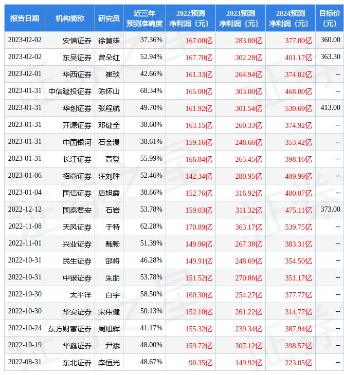數(shù)據(jù)中心根據(jù)近三年發(fā)布的研報(bào)數(shù)據(jù)計(jì)算,中信建投(601066)證券陳懷山研究員團(tuán)隊(duì)對(duì)該股研究較為深入,近三年預(yù)測(cè)準(zhǔn)確度均值為68.34%,其預(yù)測(cè)2022年度歸屬凈利潤(rùn)為盈利165億,根據(jù)現(xiàn)價(jià)換算的預(yù)測(cè)PE為52.03。