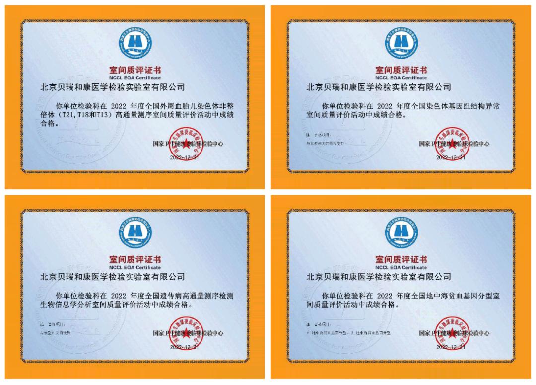 近日,國家衛(wèi)生健康委臨床檢驗(yàn)中心(NCCL)公布了2022年全國室間質(zhì)評結(jié)果,貝瑞基因(000710)旗下北京貝瑞和康醫(yī)學(xué)檢驗(yàn)實(shí)驗(yàn)室(下稱“北京醫(yī)學(xué)檢驗(yàn)實(shí)驗(yàn)室”)外周血胎兒染色體非整倍體(T21,T18和T13)高通量測序、遺傳病高通量測序檢測生物信息學(xué)分析、染色體基因組結(jié)構(gòu)異常、地中海貧血基因分型等十二項(xiàng)質(zhì)評均順利通過,同時,貝瑞基因上海、青島醫(yī)學(xué)檢驗(yàn)實(shí)驗(yàn)室也均獲得合格證書,綜合實(shí)力再次獲權(quán)威認(rèn)證!