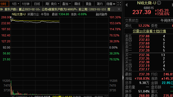 科創(chuàng)板新股裕太微今日上市,早盤以182.61%的漲幅大幅高開(kāi),盤中最高漲幅190%以上,截至收盤報(bào)價(jià)237.39元/股,上漲158.03%。按早盤最高股價(jià)268元/股計(jì)算,打新的投資者中一簽可賺8.8萬(wàn)元,這也使得裕太微成為2023年第一大肉簽。