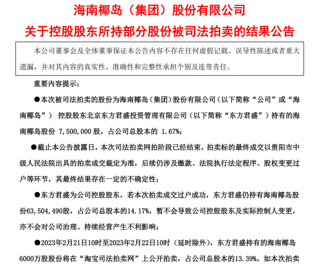 實(shí)際上,這已經(jīng)不是東方君盛所持股份的首次拍賣。海南椰島此前公告稱,貴陽中級人民法院已于2023年1月1日拍賣東方君盛所持公司全部7568.64萬股,占公司總股本的16.84%。不過至1月4日,首次拍賣標(biāo)的物已流拍,流拍原因系無人出價(jià)。