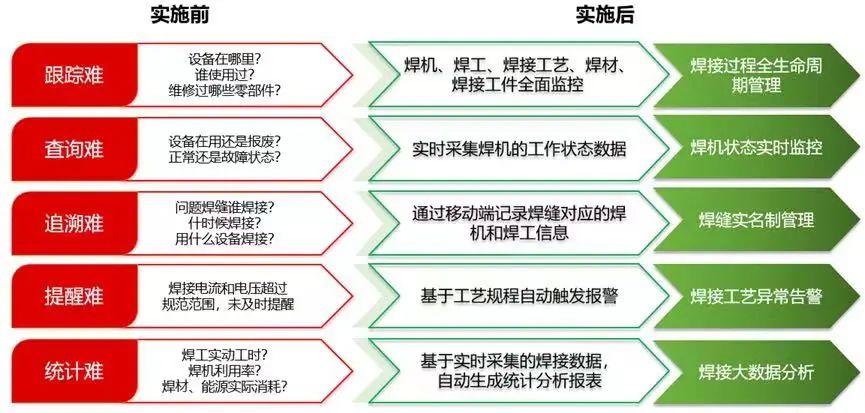 通過(guò)這一系統(tǒng)的應(yīng)用,只需要在屏幕上即可一覽車間所有焊機(jī)的實(shí)時(shí)工作狀態(tài),并實(shí)現(xiàn)焊接全生命周期的監(jiān)測(cè)和管理,實(shí)現(xiàn)焊縫實(shí)名制管理、焊接質(zhì)量追溯、焊接過(guò)程遠(yuǎn)程監(jiān)控和焊接大數(shù)據(jù)分析,同時(shí)為管理者對(duì)人員和設(shè)備績(jī)效的考核、焊接工藝質(zhì)量分析、生產(chǎn)過(guò)程的資源調(diào)度優(yōu)化、設(shè)備的運(yùn)行維護(hù)提供重要的支撐數(shù)據(jù)。