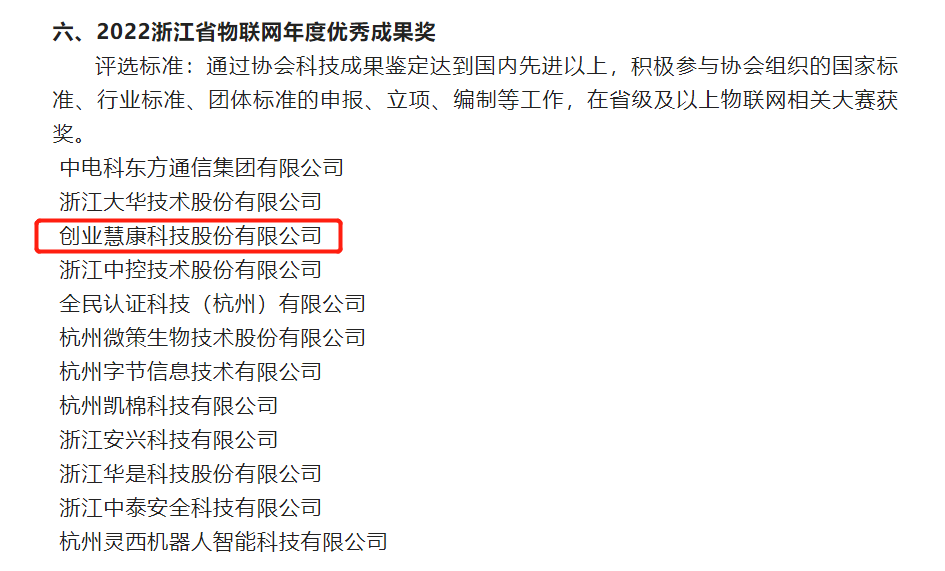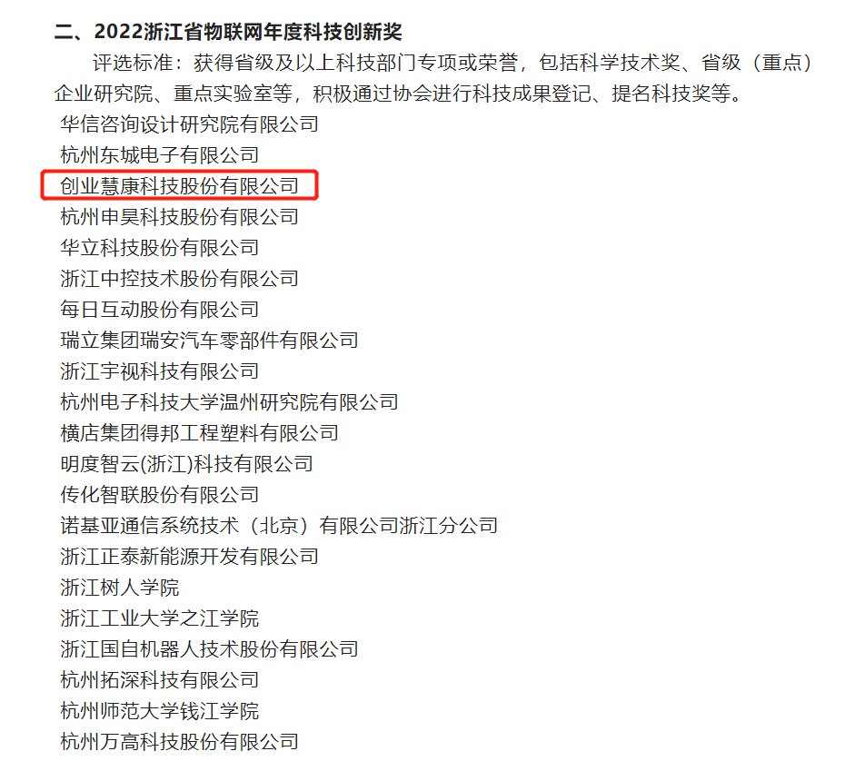 近日,浙江省物聯(lián)網(wǎng)產(chǎn)業(yè)協(xié)會公布了《關(guān)于2022浙江省級物聯(lián)網(wǎng)年度獎項候選單位的公示》名單,創(chuàng)業(yè)慧康(300451)憑借在物聯(lián)網(wǎng)領(lǐng)域的突出表現(xiàn)和創(chuàng)新能力,榮獲2022浙江省物聯(lián)網(wǎng)年度“科技創(chuàng)新獎”和“優(yōu)秀成果獎”兩項榮譽。