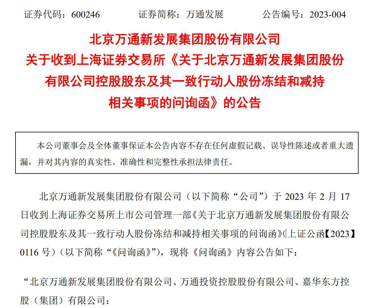 2023年2月18日,萬通發(fā)展(600246)收到上海證券交易所《關(guān)于北京萬通新發(fā)展集團股份有限公司控股股東及其一致行動人股份凍結(jié)和減持相關(guān)事項的問詢函》,問詢函載明,“上海證券交易所上市公司管理一部多次督促并于2月13日向你公司發(fā)出監(jiān)管工作函,要求核實相關(guān)情況并及時履行信息披露義務(wù)。截至2023年2月17日,你公司仍未披露相關(guān)公告。2月17日,公司公告顯示,控股股東及其一致行動人近期通過大宗交易累計減持公司股份2117萬股,占公司總股本的1.03%?!?/p>