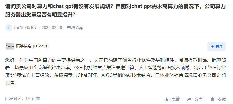 中國(guó)財(cái)富通2月22日 - 拓維信息(002261)(002261)在互動(dòng)平臺(tái)上表示,作為中國(guó)AI算力的主要提供商之一,公司已構(gòu)建了涵蓋行業(yè)軟件及基礎(chǔ)硬件,貫通模型訓(xùn)練、推理部署、場(chǎng)景應(yīng)用全流程的解決方案。公司將持續(xù)重點(diǎn)關(guān)注先進(jìn)計(jì)算、人工智能等前沿技術(shù)領(lǐng)域,將基于“AI+行業(yè)服務(wù)”領(lǐng)域的豐富經(jīng)驗(yàn),積極探索與ChatGPT、AIGC類似的新技術(shù)結(jié)合。