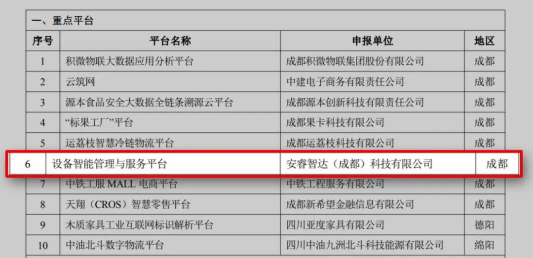 日前,四川省經(jīng)濟和信息化廳對外發(fā)布了《關(guān)于四川省新經(jīng)濟重點平臺和新場景名單(第一批)的公示》。由安睿智達(成都)科技有限公司自主研發(fā)的“設(shè)備智能管理與服務(wù)”平臺,獲選為10個四川省首批新經(jīng)濟重點平臺之一。