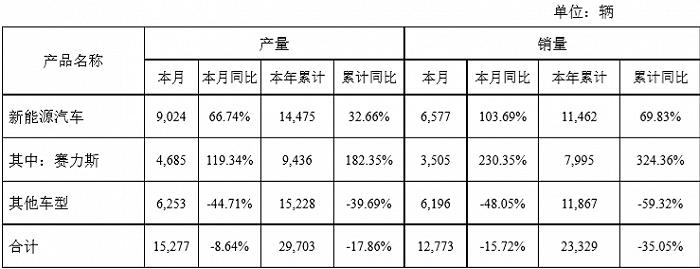 賽力斯2月新能源汽車銷量6577輛,同比上漲103.69%。