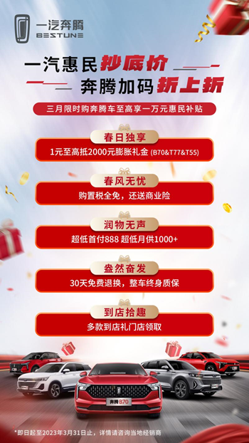 目前,一汽奔騰在售車型覆蓋了8-18萬價格區(qū)間,擁有B系列車型B70、B70S,T系列SUV車型T55、T77、T99,可滿足不同使用需求、不同價格需求用戶。此次活動多重購車政策疊加,可以說是一汽奔騰回饋省內(nèi)用戶的超級福利。