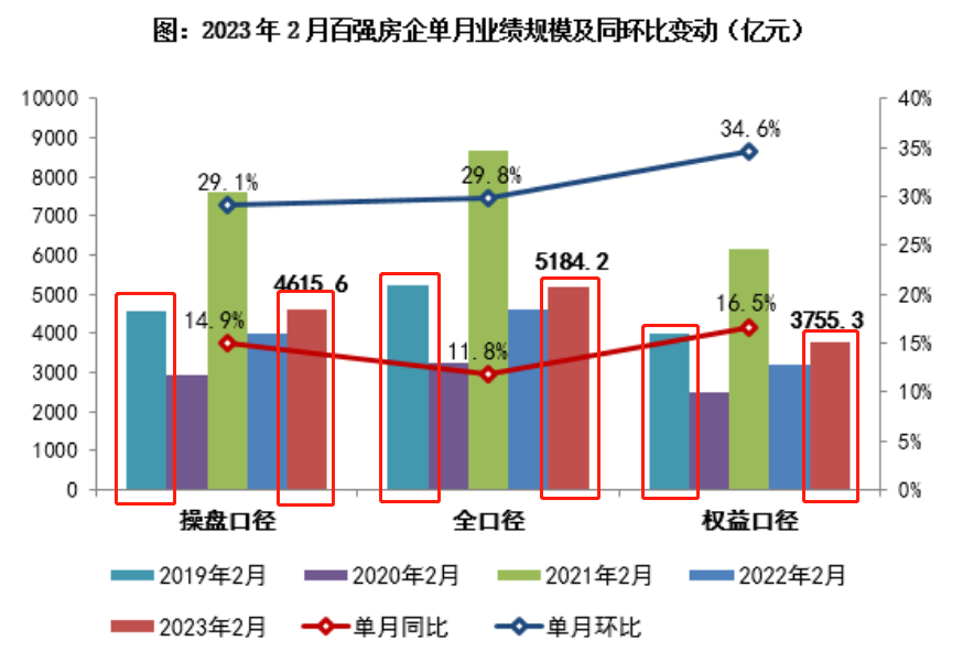 隨著近日各房企陸續(xù)公布今年前兩個(gè)月的銷售業(yè)績,房地產(chǎn)行業(yè)復(fù)蘇預(yù)期似乎已基本確立??硕鹦袠I(yè)數(shù)據(jù)顯示,今年2月,TOP100房企實(shí)現(xiàn)銷售操盤金額4615.6億元,單月業(yè)績環(huán)比增長29.1%、同比增長14.9%,無論是操盤口徑、全口徑還是權(quán)益口徑,均已基本恢復(fù)至疫情前2019年的水平。