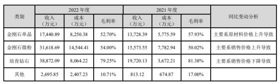 從毛利率來看,2022年,力量鉆石培育鉆石、金剛石微粉和金剛石單晶毛利率分別為79.25%、54%、52.7%,上年同期,它們毛利率分別為81.38%、50.02%、57.93%。