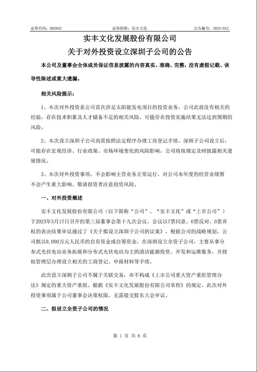實豐文化(002862)3月17日晚發(fā)布公告,擬投資8000萬元在深圳設(shè)立全資子公司,主要從事分布式光伏電站業(yè)務(wù)拓展和分布式光伏電站為主的清潔能源投資、開發(fā)和運維服務(wù)。