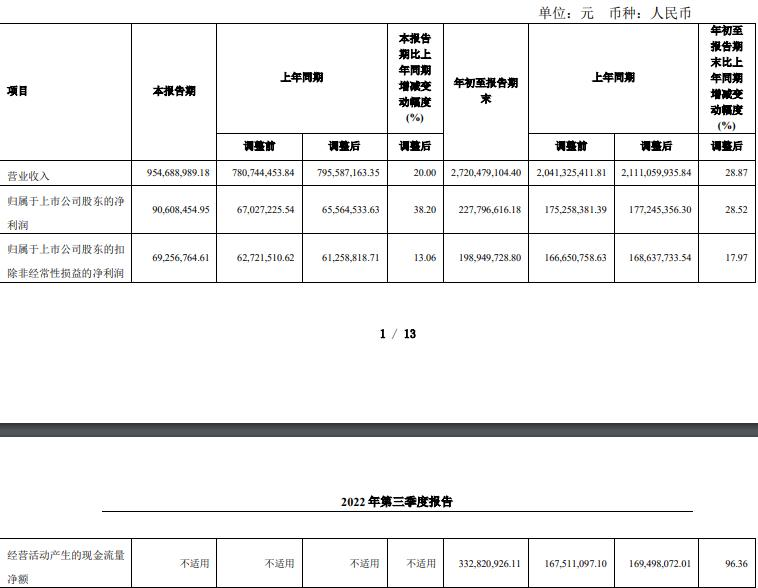 據(jù)永和股份2022年三季報,去年第三季度,公司實現(xiàn)營業(yè)收入9.55億元,同比增長20.00%;實現(xiàn)歸屬于上市公司股東的凈利潤9060.85萬元,同比增長38.20%;實現(xiàn)歸屬于上市公司股東的扣除非經(jīng)常性損益的凈利潤6925.68萬元,同比增長13.06%。