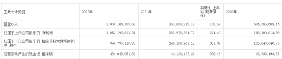 公司2022年實(shí)現(xiàn)營(yíng)業(yè)收入達(dá)到20億元,同比增長(zhǎng)108%,跟2020年相比更是大增超200%;實(shí)現(xiàn)凈利潤(rùn)10.52億元,實(shí)現(xiàn)扣非凈利潤(rùn)9.95億元,上述數(shù)據(jù)同比和與2020年相比的增速分別為274%、459%及307%、690%。