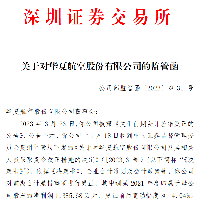 北京3月24日訊 昨日,深交所披露關(guān)于對華夏航空(002928)股份有限公司(股票簡稱:華夏航空,股票代碼:002928.SZ)的監(jiān)管函。