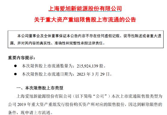 電池片龍頭愛旭股份(600732)(600732)將在3月29日解禁2.16億股限售股,這部分股票為公司實控人陳剛及其一致行動人自2019年的重組而持有。在禁售期內(nèi),愛旭股份經(jīng)歷了業(yè)績不達標、股東業(yè)績補償?shù)取安迩保罱K這部分股份在三年半后得以解鎖。