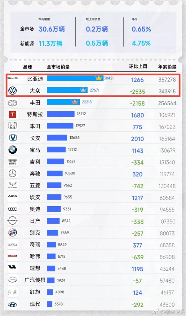 具體數(shù)據(jù)方面,本周,比亞迪2023年累計銷量357278輛,超越大眾(一汽大眾+上汽大眾)的343915輛。豐田以256564輛位居第三。