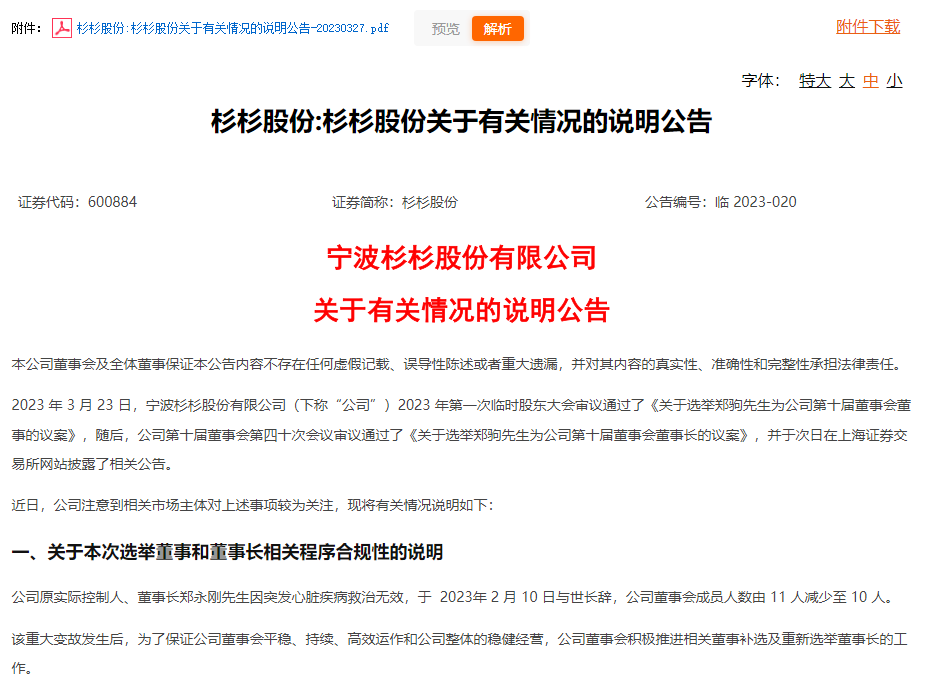 3月26日,上交所對杉杉股份下發(fā)監(jiān)管工作函,要求督促公司及相關(guān)方妥善處理有關(guān)事項(xiàng),保障上市公司經(jīng)營穩(wěn)定和規(guī)范運(yùn)作。