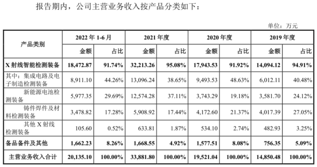 招股資料顯示,目前,公司主營業(yè)務中X射線智能檢測裝備占比到90%以上,是公司核心業(yè)務,其中集成電路及電子制造檢測裝備2022上半年占比44%,新能源電池檢測裝備占比30%,鑄件焊件及材料檢測裝備占比17%。