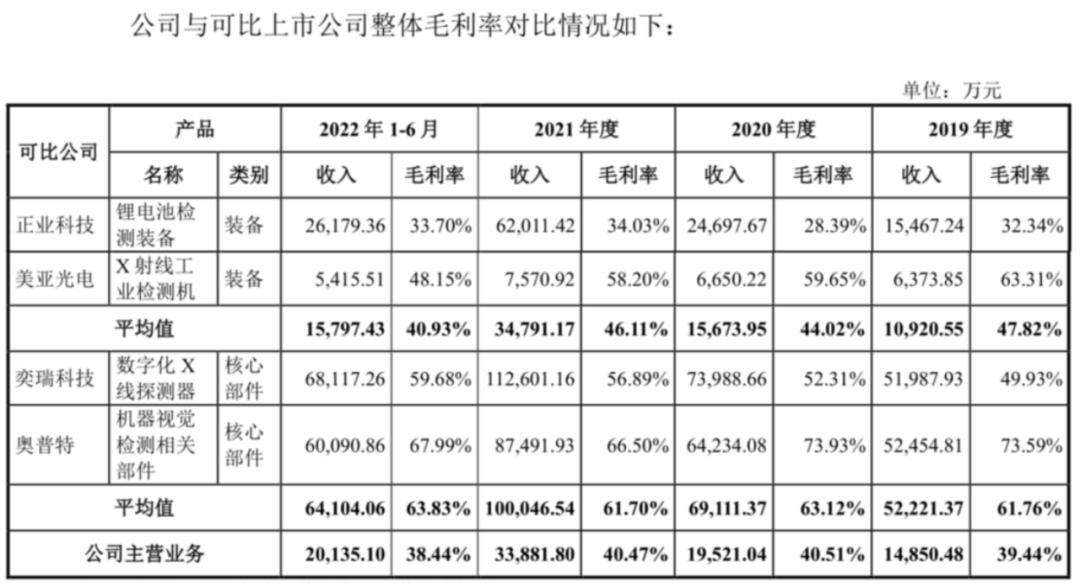 毛利率水平更是被同行拉開巨大差距。數(shù)據(jù)顯示,日聯(lián)科技2019-2021年及2022上半年主營業(yè)務毛利率分別為39.44%、40.51%、40.47%和38.44%,同一時期同業(yè)裝備毛利率的平均值為47.82%、44.02%、46.11%、40.93%,核心部件的毛利率平均值 61.76%、63.12%、61.7%、63.83%,均拉開日聯(lián)科技數(shù)個身位,最大差值超過了25個百分點。