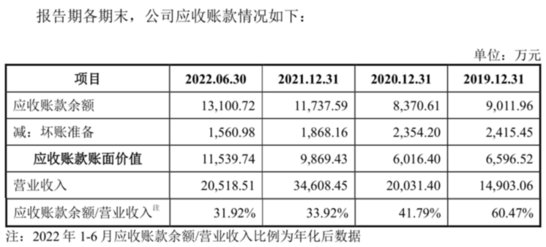 2019-2021年及2022上半年,公司應收賬款賬余額分別為9011.96萬元、8370.61萬元、1.17億元和1.31億元,占當期營業(yè)收入的比例分別為60.47%、41.79%、33.92%、31.92%;其中壞賬準備分別為2415.45萬元、2354.2萬元、1868.16萬元和1560.98萬元,相比于各期凈利潤831.84萬元、2137.62萬元、5081.59萬元和2108.01萬元而言,占據(jù)著極大的比例。