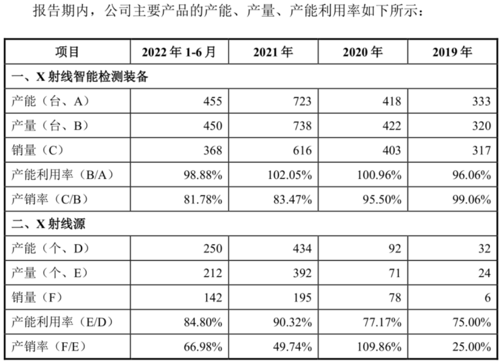 此背景下,公司2022年上半年在線型檢測設備生產(chǎn)周期延長約14天,毛利率水平和銷售設備數(shù)量均受到較大影響。招股數(shù)據(jù)同樣顯示,公司X射線智能檢測裝備產(chǎn)銷率已經(jīng)由2019年的99.06%大幅跌至2022上半年的81.78%,X射線源的產(chǎn)銷率也由2020年的109.86%跌至2022上半年的66.98%。