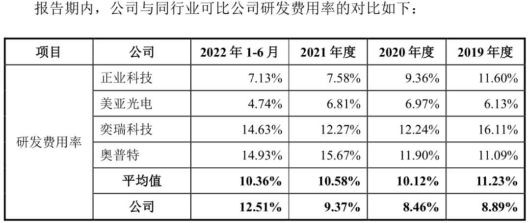 然而面對如此局面,公司報告期內公司研發(fā)費用率分別為8.89%、8.46%、9.37%和12.51%,同期同行業(yè)可比公司研發(fā)費用率平均值為11.23%、10.12%、10.58%和10.36%。公司不僅業(yè)績規(guī)模低于可比公司,研發(fā)費用率也低于同行業(yè)領先公司,且多數(shù)年份也低于行業(yè)均值水平。