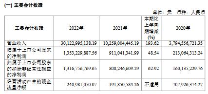 3月28日,容百科技披露年報,2022年實現(xiàn)營業(yè)收入301.23億元,同比增長193.62%;實現(xiàn)歸屬上市公司凈利潤13.53億元,同比增長48.54%。公司擬向全體股東每10股派發(fā)現(xiàn)金紅利3.02元(含稅)。