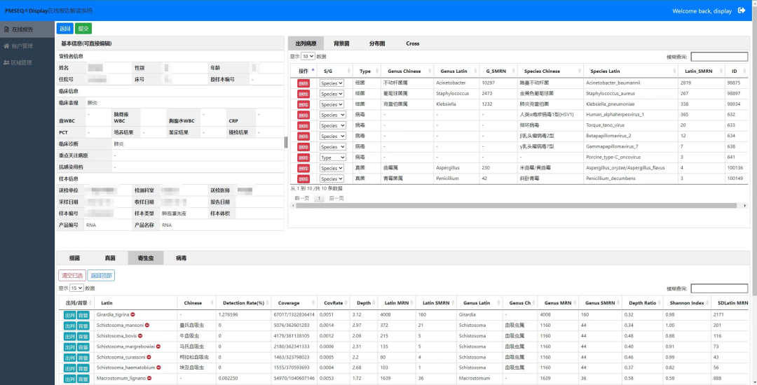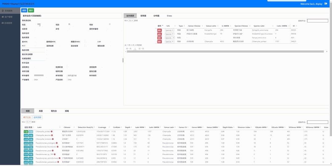 PM Display智能報告系統(tǒng)是配套PMseq 病原微生物高通量測序產(chǎn)品的組學大數(shù)據(jù)分析系統(tǒng),實現(xiàn)對PMseq 病原檢測后的檢測結(jié)果歸集、存儲、統(tǒng)計、分析、數(shù)據(jù)挖掘。使用可視化操作界面,人工確定檢出病原為最終臨床報告。該系統(tǒng)帶自我學習功能,在使用過程中不斷結(jié)合用戶給出的結(jié)果優(yōu)化默認推薦病原,并能結(jié)合PM Online給出不同病原的檢出分布。