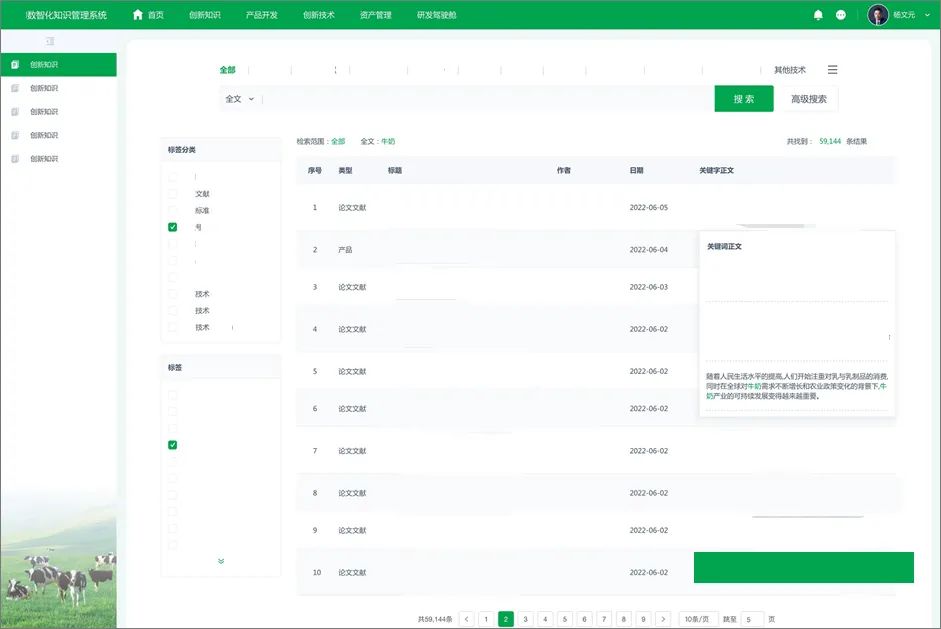 結(jié)合乳品研發(fā)業(yè)務(wù)的知識(shí)關(guān)鍵詞、分類、標(biāo)簽等多維度建立統(tǒng)一的知識(shí)搜索中心,貼近科研工作者使用偏好,滿足模糊查詢以及精準(zhǔn)定位的要求,并可根據(jù)業(yè)務(wù)標(biāo)簽的條件組合自動(dòng)聚類,實(shí)現(xiàn)知識(shí)資源的穿透與關(guān)聯(lián),在業(yè)務(wù)中充分利用相關(guān)歷史知識(shí)資源。