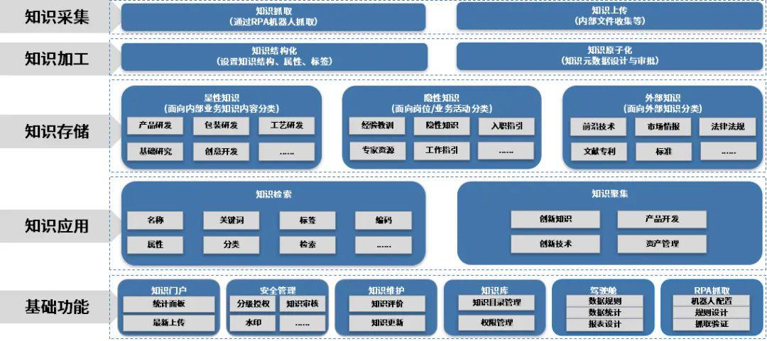 外部知識(shí)進(jìn)行結(jié)構(gòu)化、標(biāo)簽標(biāo)引等數(shù)據(jù)處理,對(duì)內(nèi)按照模塊進(jìn)行自動(dòng)分類,基于智能標(biāo)簽索引形成知識(shí)體系,構(gòu)建內(nèi)外統(tǒng)一存儲(chǔ)的知識(shí)倉(cāng)庫(kù)。