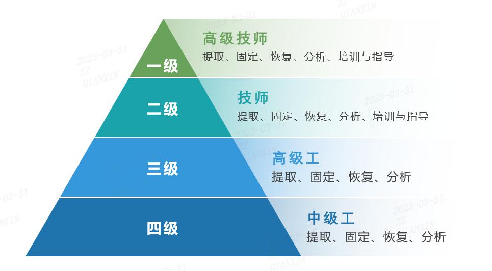 電子數(shù)據(jù)取證分析師技能等級(jí):本職業(yè)共設(shè)四個(gè)等級(jí),分別為:四級(jí)/中級(jí)工、三級(jí)/高級(jí)工、二級(jí)/技師、一級(jí)/高級(jí)技師。