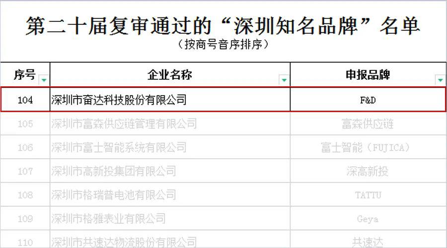 2022年3月,第二十屆“深圳知名品牌”培育評(píng)價(jià)活動(dòng)開啟,奮達(dá)科技(002681)旗下自有品牌“F&D”通過復(fù)審,繼續(xù)入選該名單。