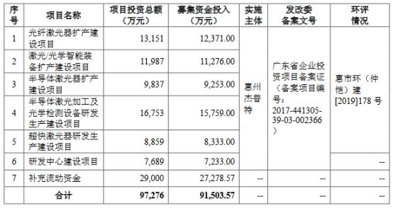 杰普特此次募集資金總額為10.13億元,扣除發(fā)行費用后募集資金凈額為9.15億元,分別用于光纖激光器擴(kuò)產(chǎn)建設(shè)項目、激光/光學(xué)智能裝備擴(kuò)產(chǎn)建設(shè)項目、半導(dǎo)體激光器擴(kuò)產(chǎn)建設(shè)項目、半導(dǎo)體激光加工及光學(xué)檢測設(shè)備研發(fā)生產(chǎn)建設(shè)項目、超快激光器研發(fā)生產(chǎn)建設(shè)項目、研發(fā)中心建設(shè)項目、補(bǔ)充流動資金。