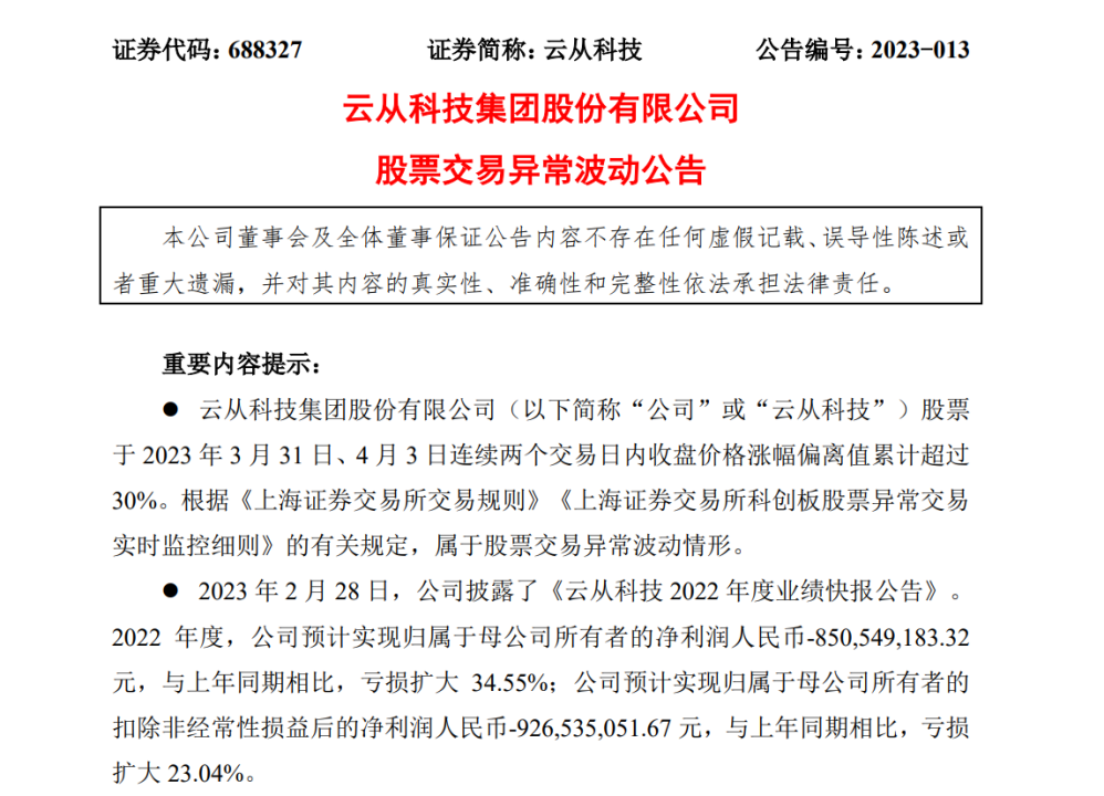 2月28日,云從科技披露了2022年度業(yè)績(jī)快報(bào)。2022年度,公司預(yù)計(jì)實(shí)現(xiàn)歸屬于母公司所有者的凈利潤(rùn)人民幣-8.51億元,與上年同期相比,虧損擴(kuò)大34.55%;公司預(yù)計(jì)實(shí)現(xiàn)歸屬于母公司所有者的扣除非經(jīng)常性損益后的凈利潤(rùn)人民幣-9.27億元,與上年同期相比,虧損擴(kuò)大23.04%。