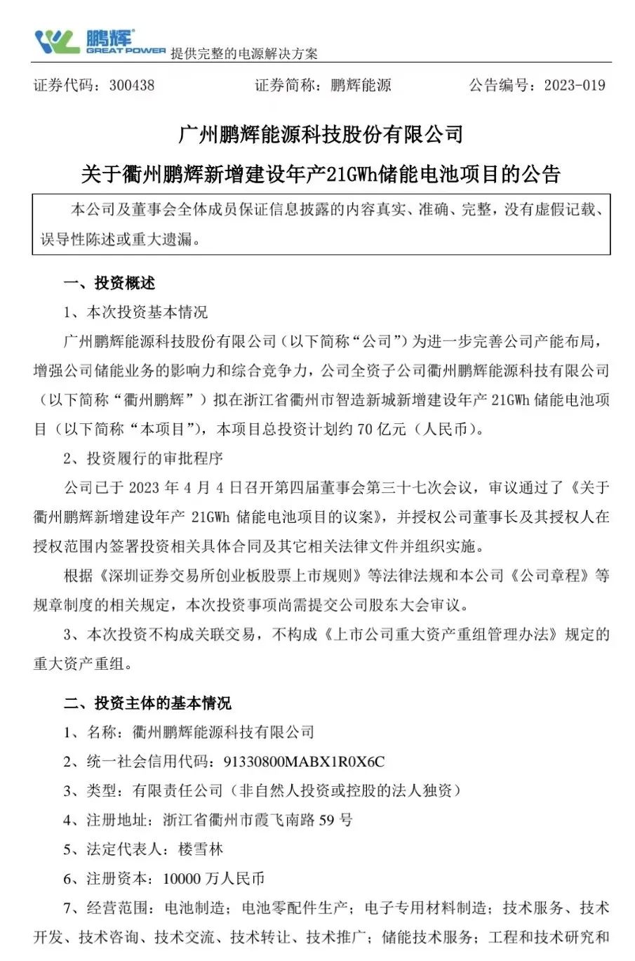 4月4日晚間,鵬輝能源(300438)連發(fā)兩條公告,擬投資70億元在浙江衢州新建年產(chǎn)21GWh儲(chǔ)能電池項(xiàng)目。擬投資3億元在河南駐馬店市新建大型儲(chǔ)能鋰離子電池生產(chǎn)線。