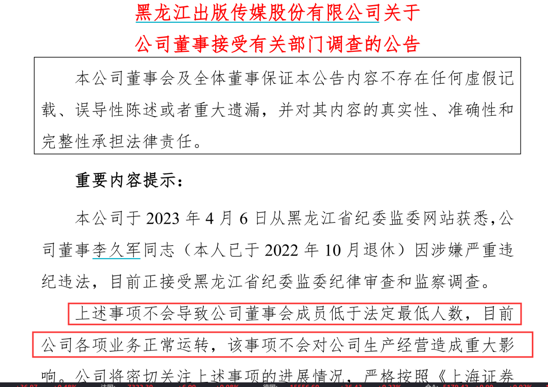 剛剛,據(jù)黑龍江省紀委監(jiān)委消息,黑龍江出版集團有限公司原黨委書記、董事長李久軍涉嫌嚴重違紀違法,目前正接受紀律審查和監(jiān)察調(diào)查。